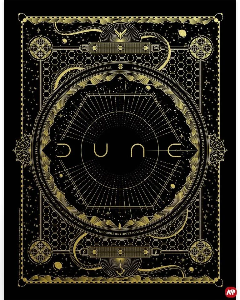 I designed based on a manuscript grid and the Golden Section to refer to the religious subtext. I used elements of the grid from Jamie Stark’s Dune (2020) poster as inspiration.