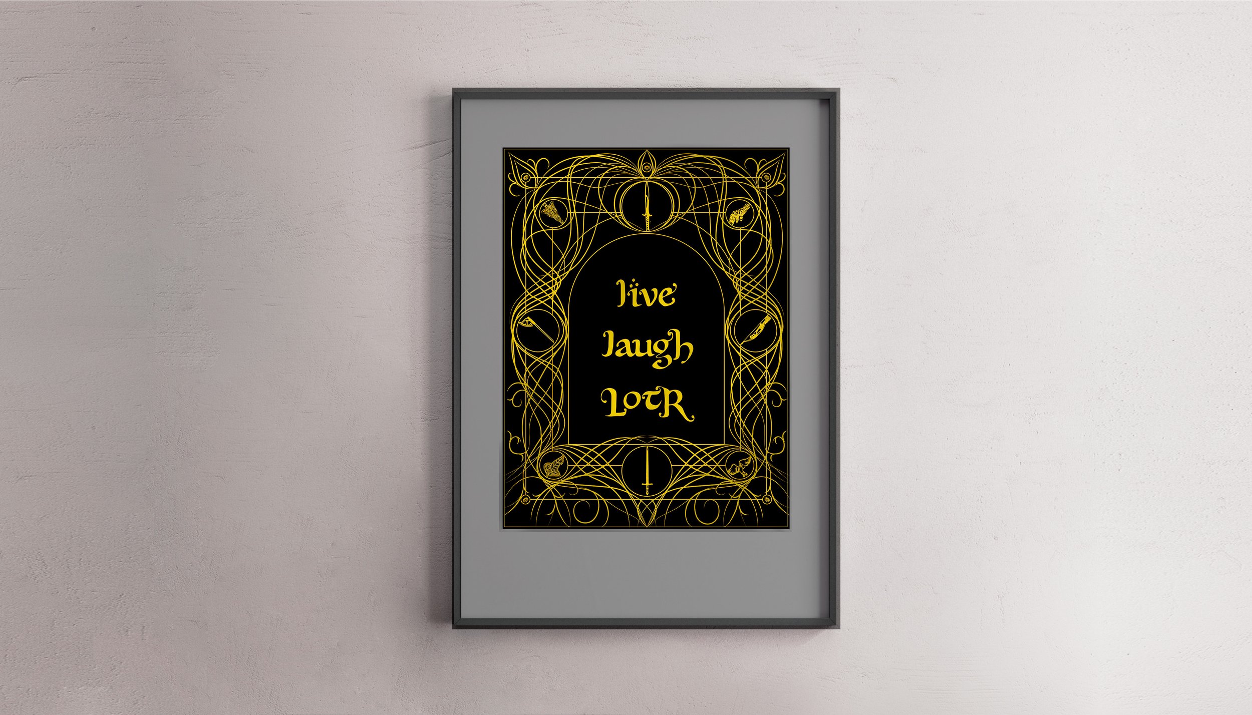 Lord of the Rings (LotR) fans who grew up with the movies are aging. LotR fan art skews high fantasy, featuring vibrant colors, high-drama action, and actors’ faces. What might it look like if it were made to hang in a more sophisticated milieu? Live, Laugh, LotR is the witty Live, Laugh, Love of LotR fan-art that stokes nostalgia and glee.