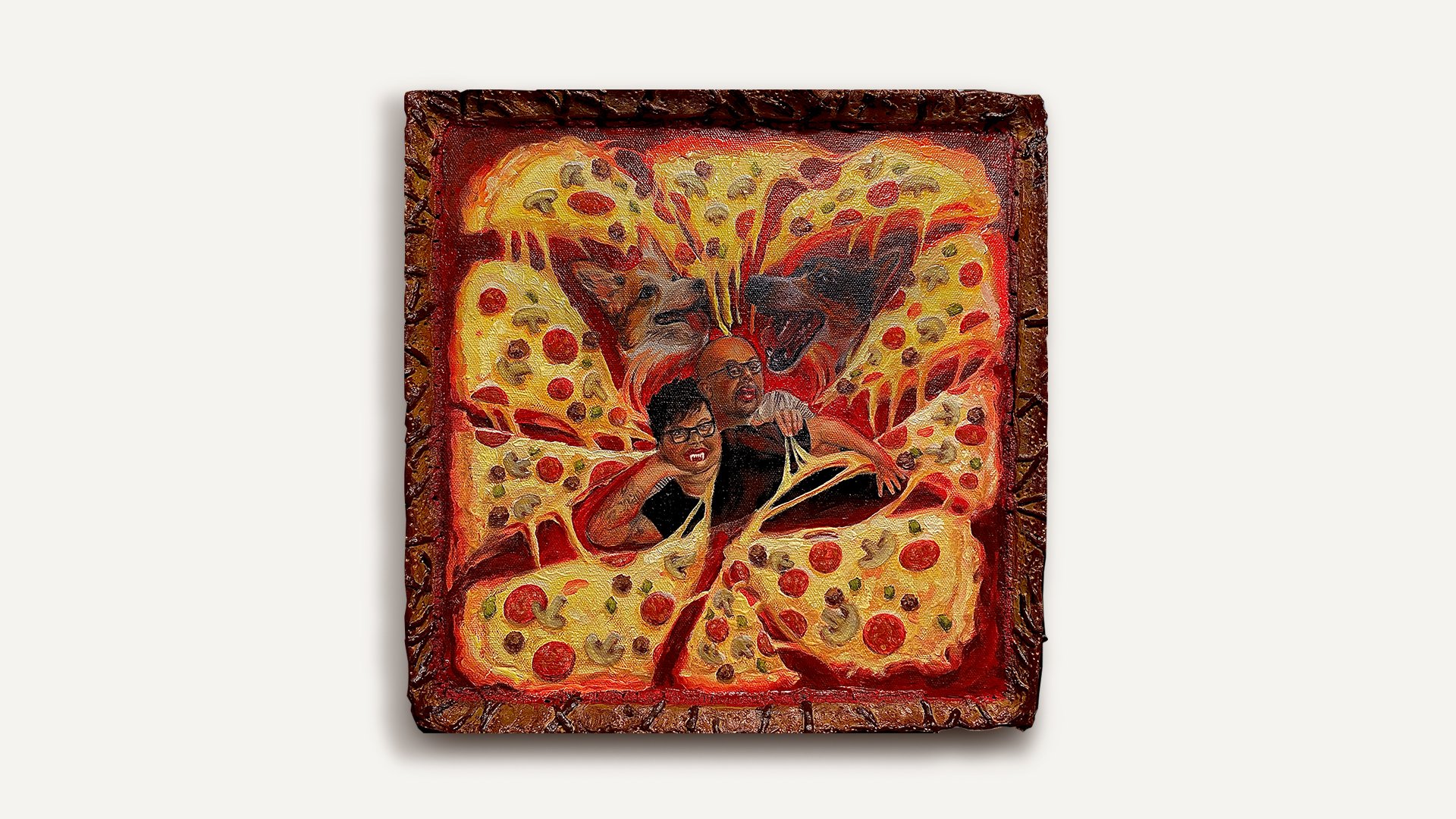 This was created as a gift for their move back to Chicago from Seattle. I painted this portrait in the style of 80’s family photos. I knew it was cheesy, so I decided to “go ham” and surround them with their favorite pizza. Since Chicago style pizza is often square, I decided to build a crust frame out of terra cotta. I built the form out of coils which I molded to the frame in four pieces, poked bubbly crust texture, added fake parmesan pieces, then baked it. I painted the crust in acrylic to extra crispy perfection, then epoxied it to the frame. Once it was completed, I boxed it up in a Chicago Style Pizza box and delivered it to them with actual pizza for their going away party.