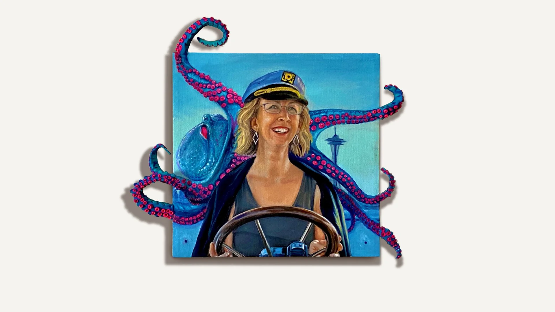 I made this as a gift for Nicole, a globe-trotting adventurer who had moved into a new apartment. I chose a photo I took of her driving a boat on Lake Union, and imagined a giant Kraken in her favorite colors rising up from the depths behind her.